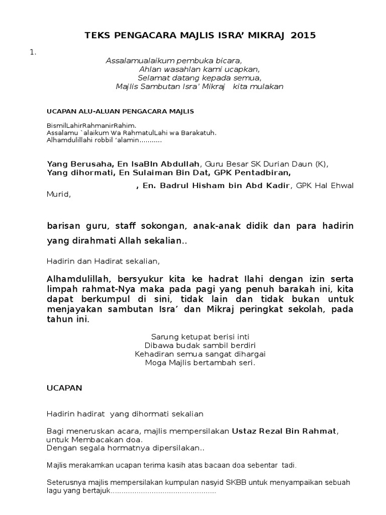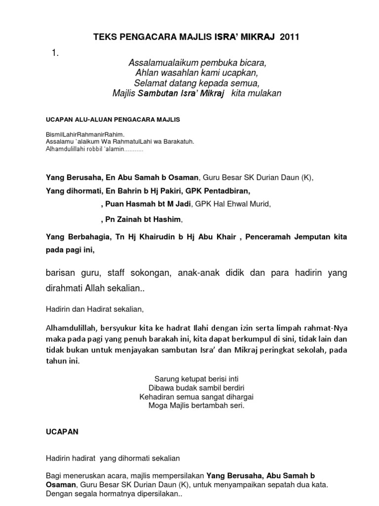 Contoh Teks Pengacaraan Majlis Formal. Assalamualaikum pembuka bicara ahlan wasahlan kami ucapkan selamat datang kepada semua majlis sambutan isra mikraj kita mulakan. Arak Mencabul Fitrah Kemanusiaan.